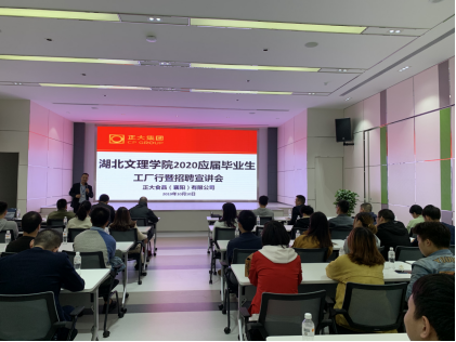 招聘宣讲环节,人力资源主管杨玲女士介绍了正大集团发展历史以及公司的招聘简章。正大集团于1979年进入中国,是第一家在中国投资的国际化企业。1995年投资襄阳,现已建成从农场到餐桌安全可追溯的猪肉食品全产业链项目,这个项目是正大集团在全球投资的第一个规模最大、智能化程度最高、产业集群融合度最好的项目。正大食品(襄阳)有限公司作为全产业链项目的终端工业项目,成立于2014年3月13日,旨在将优质、健康、美味的正大食品传递至千家万户,塑造国际一流的肉类食品加工品牌。正大集团一直践行着企业的发展离不开人才的用人理念,认为人才即是核心竞争力,时刻期待优秀人才的加入。