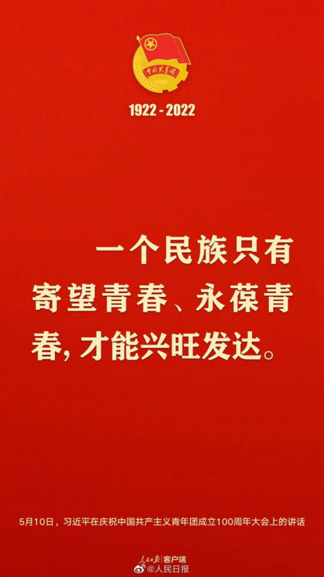 共青团成立100周年,这100年就是一部百年青年运动史,就是一部共青团带领广大青年矢志不渝跟党走的忠诚史;也是一部共青团带领广大青年赤子丹心图报国的奉献史;更是一部共青团团结广大青年凝心聚力促发展的奋斗史。不忘初心跟党走,是共青团百年发展的基本遵循。青年者,人生之王,人生之春,人生之华也。新时代中国青年处在中华民族发展的最好时期,中华民族伟大复兴终将在广大青年的接力奋斗中变为现实。在习近平总书记的关心鼓励下,新时代的中国青年都是改革闯将,豪情满怀,经得起风雨、受得住磨砺、扛得住摔打,成为中华民族生气勃发、高歌猛进的亮丽风景。