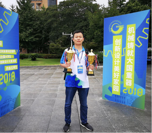 在备战的最后阶段,为了准备好作品的展板以及宣传册,他常常顶着三十多度的高温扛着展板往返于公司西门的印刷店与工科楼之间。在经历了校赛过后,他所在的团队以极大的优势胜出,并且在第八届全国老员工机械创新设计大赛中,他凭借参赛作品“魔方式立体停车库”获得了全国一等奖以及优秀成果转化奖,该作品还得到了中国工程院王天然院士的高度评价,同时被大赛的赞助商“江苏金冠停车产业股份有限公司”现场收购。