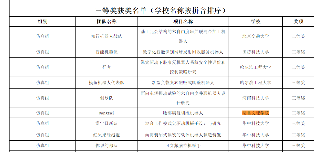 (威廉官方网站 通讯员 秦涛)8月24-25日,“光谷杯”第三届中国研究生机器人创新设计大赛全国总决赛在华中科技大学举行,决赛采用线上“视频展示+PPT答辩”的方式。公司威廉官方网站秦涛老师指导的研究生刘鹏、任鹏、马渊明、邱金星、魏超完成的项目《腰部康复训练机器人》荣获全国三等奖,是所有获奖单位中唯一一所冠名“公司”的高校。