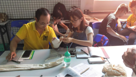上午9点,课程开始了。首先李清华老师带领全体学员唱国歌,并总结了昨天的学习内容。接下来,主讲师夏宏亮为学员们讲述了引起中暑的一些原因和解决方法后,便开始了今天的主要课程——创伤救护技术。夏老师通过PPT为学员们展示各种创伤“压,包,塞,捆”的止血方法、外伤急救的注意事项以及外出血和内出血的处理方法。紧接着方梦萍老师带领学员们进行实操训练。最后,夏老师给学员们总结了现场急救的策略和十不要。下午,学员们进行理论考核与实操考核。学员们在紧张的气氛中完成了实操考核,也结束了两天对紧急救援的学习。